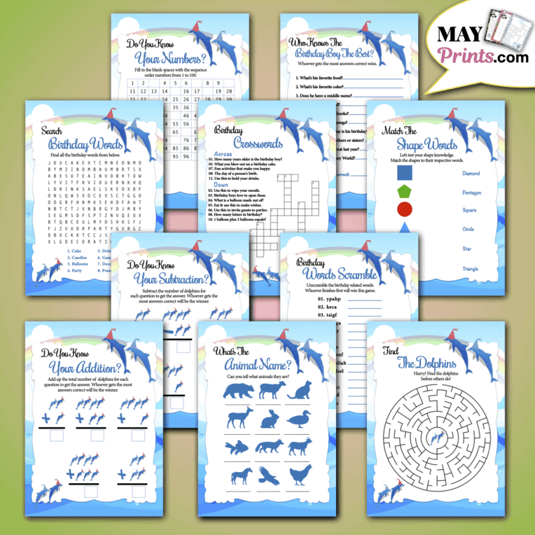 This listing is for 10 printable dolphin birthday party games that you can print in the comfort of your own home.