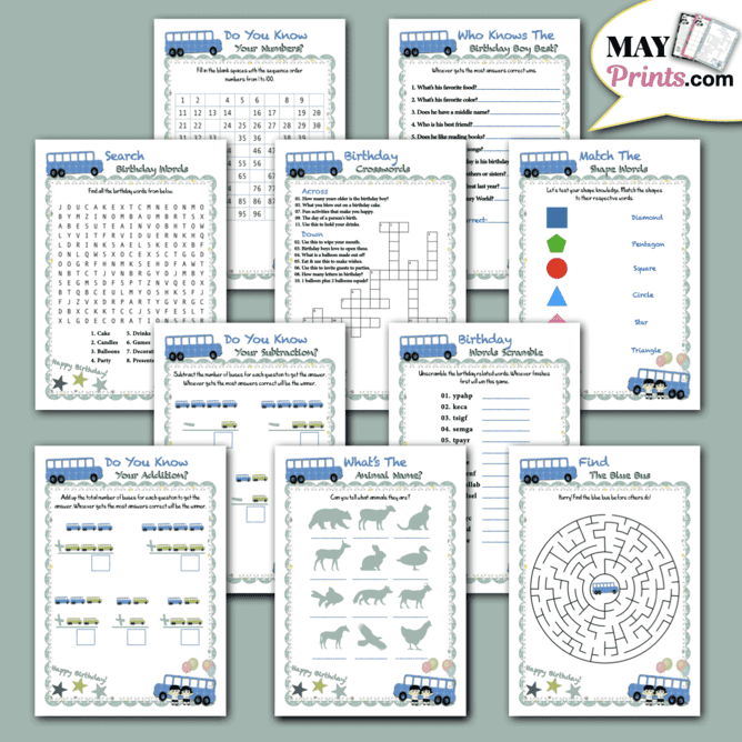 The school bus themed birthday party games come with 10 printables in a set. They are designed to be used for a boy’s birthday party.