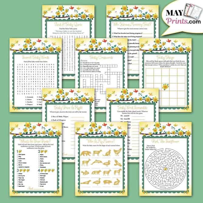 These sunflower baby shower games come with 10 printable games and BONUSES. This is super cute with yellow background with sunflowers and four beautiful birds. Please read below for details.
